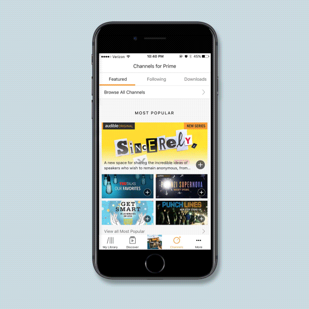 The cover art and branded needed to showcase the quality of Audible exclusive short form content. Channels topics range from comedy and short fiction to history lectures and audio news. Audible and Amazon Prime listeners can get access to original series and handcrafted playlists.